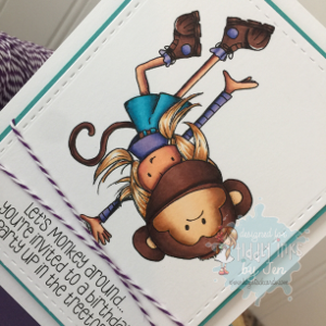 My daughter is having her birthday party at a high ropes course called Go-Ape! so I knew the Tiddly Inks Monkey Around - Wryn digi would be perfect for this occasion. I printed her on my black and white laser printer with a computer generated sentiment then colored her with my Copics. I die cut the panel with my stitched rectangles die and matted that layer on turquoise cardstock. That panel is then mounted to a white card base with craft foam for more stability.